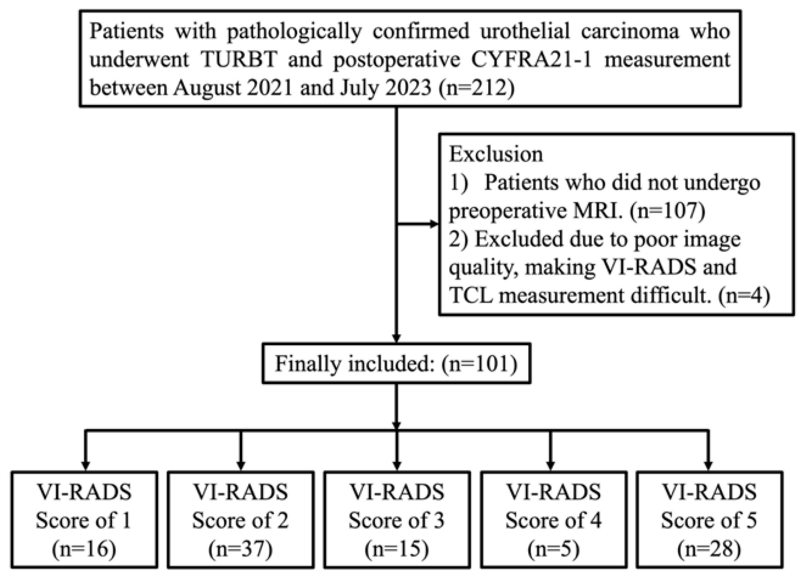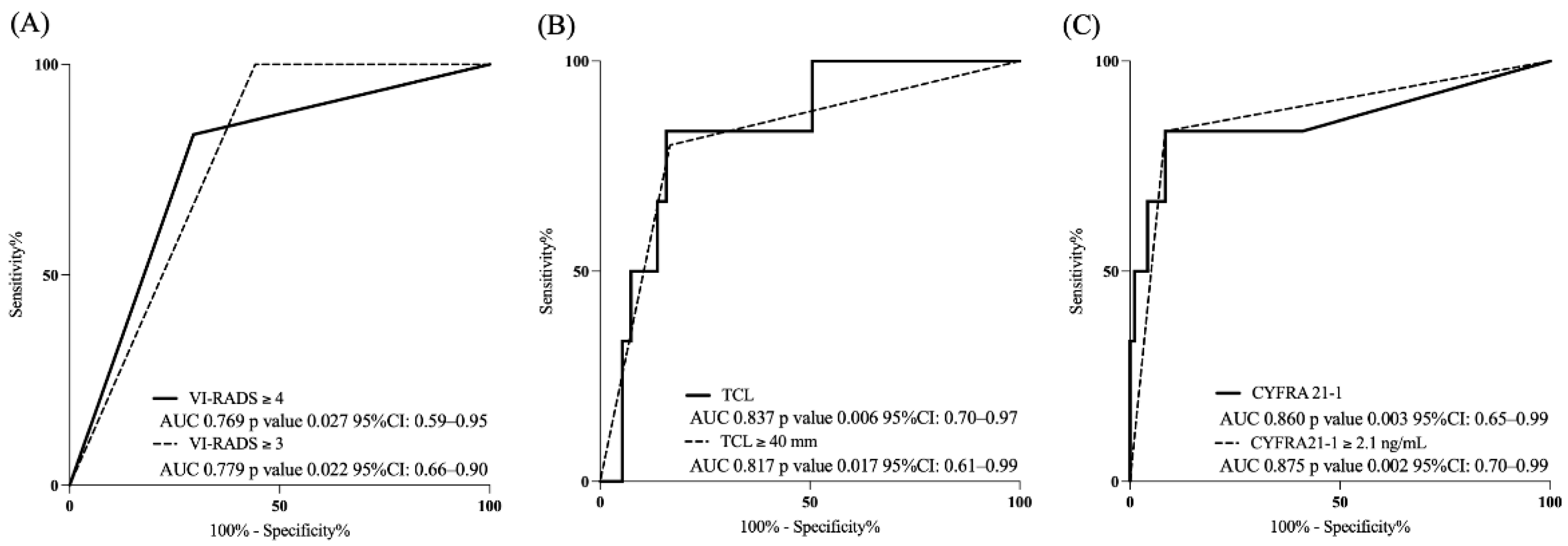 - Ikuma, S.; Akatsuka, J.; Kaneko, G.; Takeda, H.; Endo, Y.; Kimura, G.; Kondo, Y. Prognostic Utility of Combining VI-RADS Scores and CYFRA 21-1 Levels in Bladder Cancer: A Retrospective Single-Center Study. Curr. Oncol. 2025, 32, 415. [Google Scholar] [CrossRef]