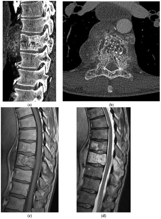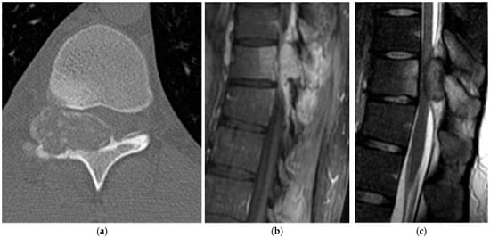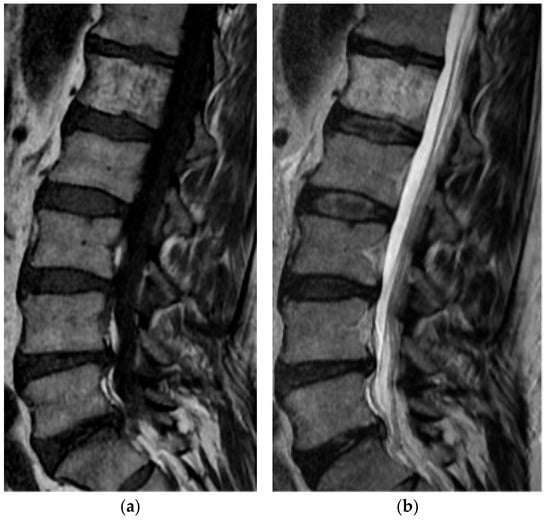 Primary lymphoma of the osseous spine is a rare extranodal malignancy, most commonly of the diffuse large-B-cell subtype [58]. Patients often present with localized bone pain, a palpable mass, and, in advanced cases, pathological fractures may occur. Neurologic complications (e.g., radiculopathy, myelopathy, or cauda equina syndrome) depend on the level and extent of spine involvement. Systemic “B” symptoms are less common than in nodal lymphomas [58,59]. The disease shows a slight male predominance and most frequently affects middle- to older-aged adults [58,59].