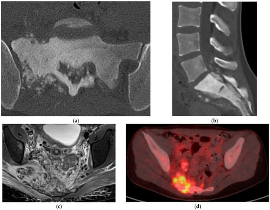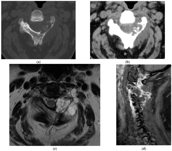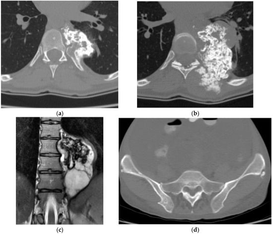 Compared with appendicular lesions, vertebral chondroblastomas more often present with a large soft tissue mass with osseous destruction and spinal canal involvement (Figure 8). Rarely, extensive lesions have been reported to cause obstructive uropathy [34]. On radiographs and CT, chondroblastomas appear as expansile lytic lesions with sclerotic margins (Figure 8a,b). Matrix calcification is present in approximately 35–50% of cases and is best visualized on CT [35].