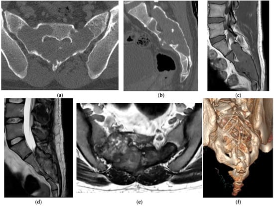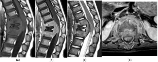 - Kwon, J.W.; Chung, H.W.; Cho, E.Y.; Hong, S.H.; Choi, S.-H.; Yoon, Y.C.; Yi, S.K. MRI Findings of Giant Cell Tumors of the Spine. AJR Am. J. Roentgenol. 2007, 189, 246–250. [Google Scholar] [CrossRef]