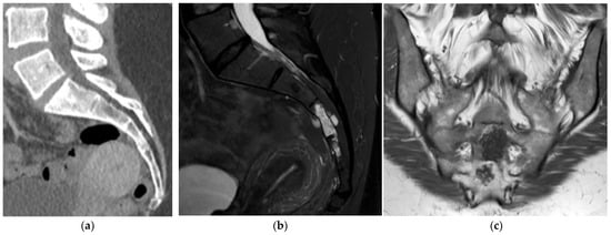 Chordoma is a rare malignant tumor arising from notochordal remnants, most commonly involving the axial skeleton—particularly the clivus, sacrum, and mobile spine [48,49]. Symptoms are location-dependent and include chronic and progressive pain, neurological deficits, and bowel or bladder dysfunction in sacral lesions [50]. Chordomas show a male predilection [51], with peak incidence in the sixth to seventh decades of life [49,52].