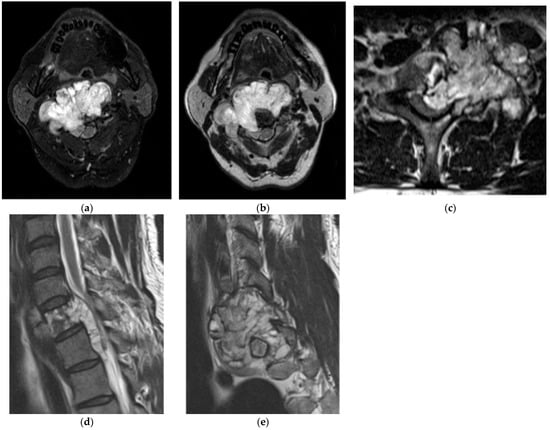 - Lee, S.H.; Kwok, K.Y.; Wong, S.M.; Chan, C.X.J.; Wong, Y.T.; Tsang, M.L. Chordoma at the Skull Base, Spine, and Sacrum: A Pictorial Essay. J. Clin. Imaging Sci. 2022, 12, 44. [Google Scholar] [CrossRef] [PubMed]