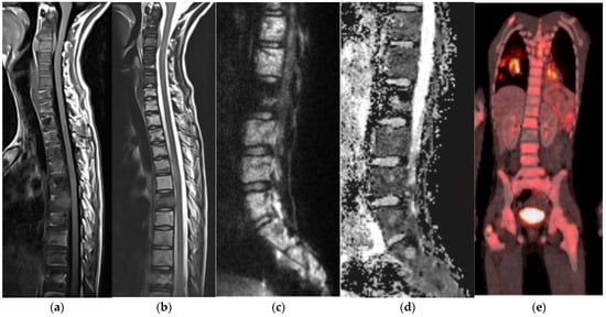 Lymphoma. (a) Sagittal T1 and (b) sagittal T2 MR, extensive marrow infiltrate with loss of normal fatty marrow signal on T1 and T2 sequences. (c) B-1000 and (d) ADC map MR sequences: restricted diffusion in the involved marrow helps diagnose lymphoma. (e) FDG PET/CT, tracer uptake in the bone marrow and right lung; PET helps with staging of lymphoma.