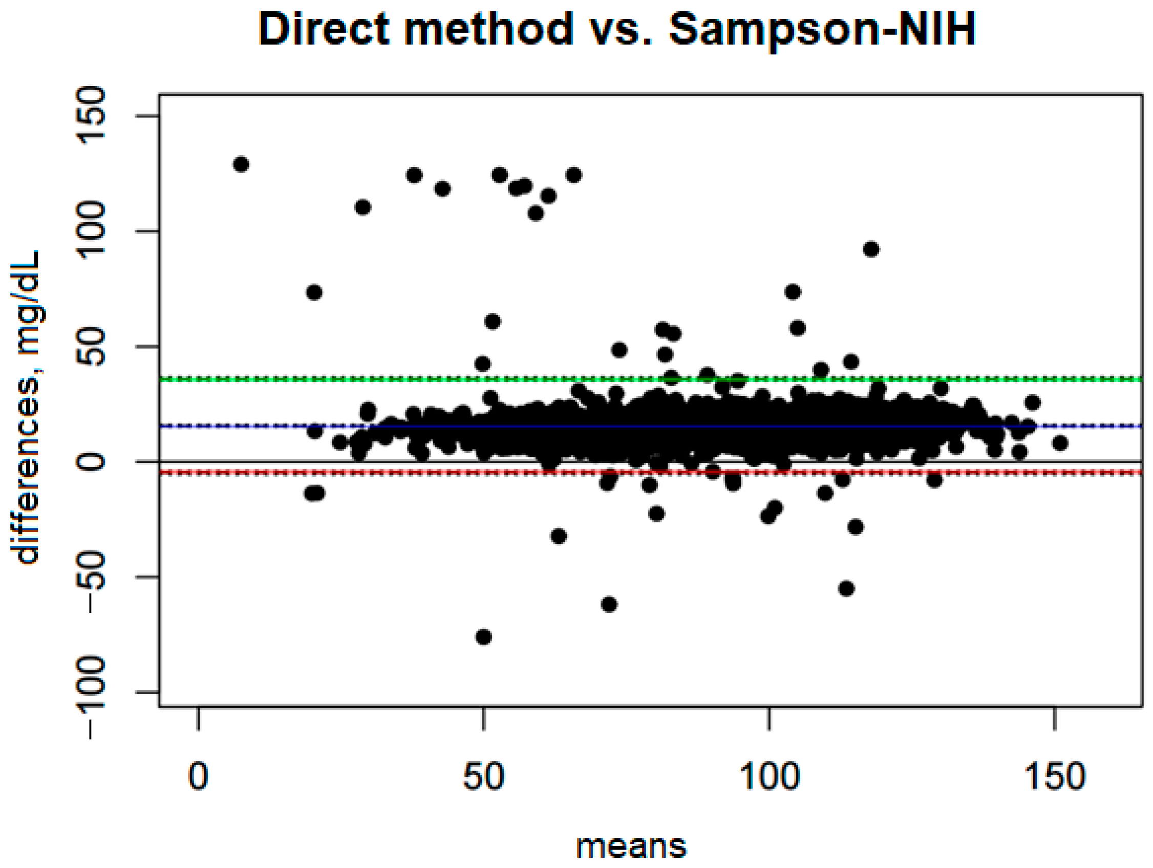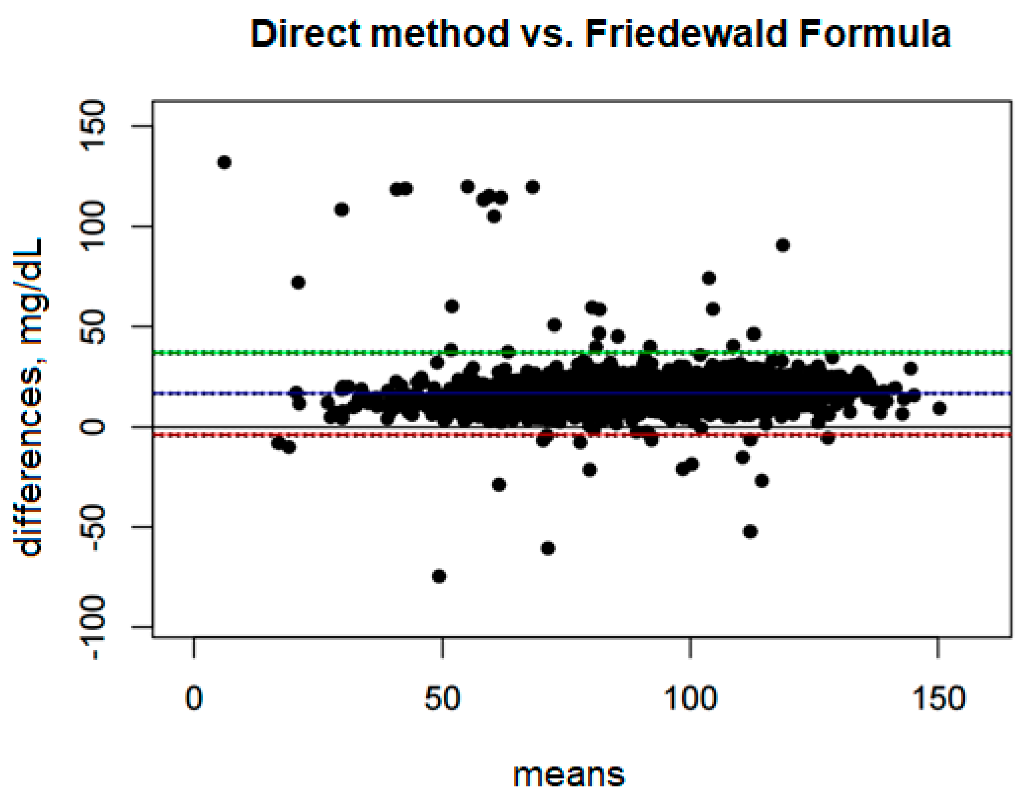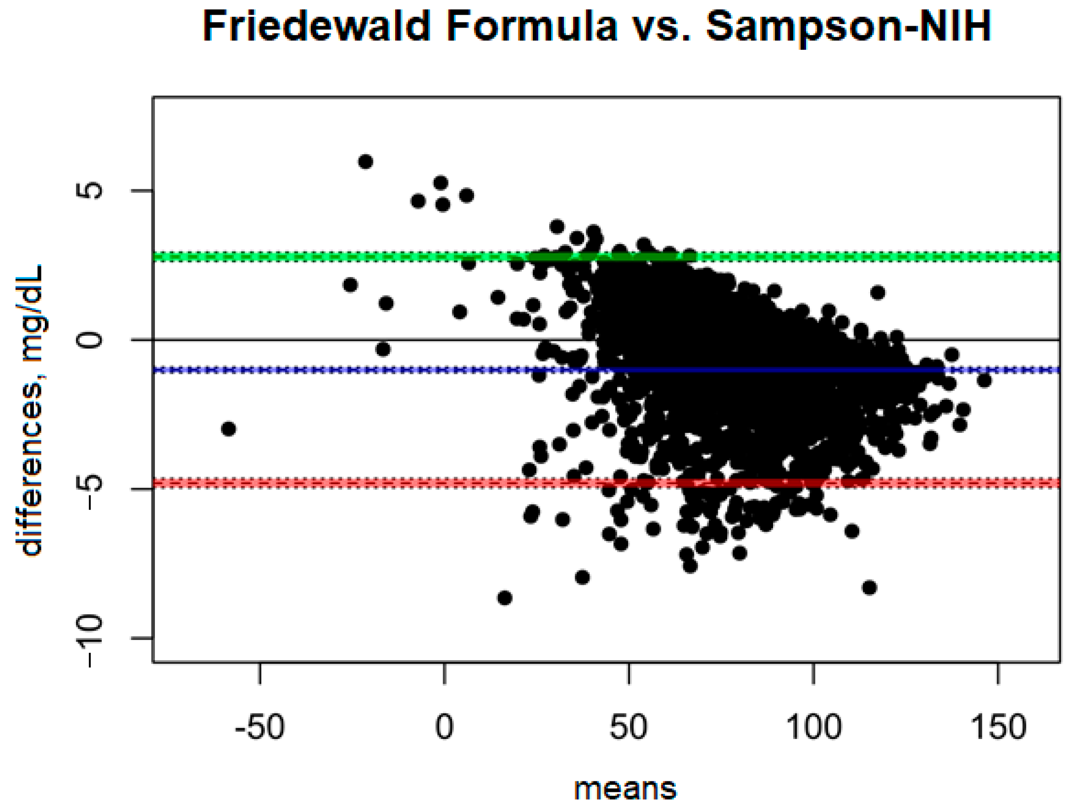 - The comparison between the Friedewald and Sampson–NIH methods indicates small although still statistically significant differences. This suggests that although both indirect methods underestimate LDL levels compared to the direct method, the differences between them are small but still detectable.