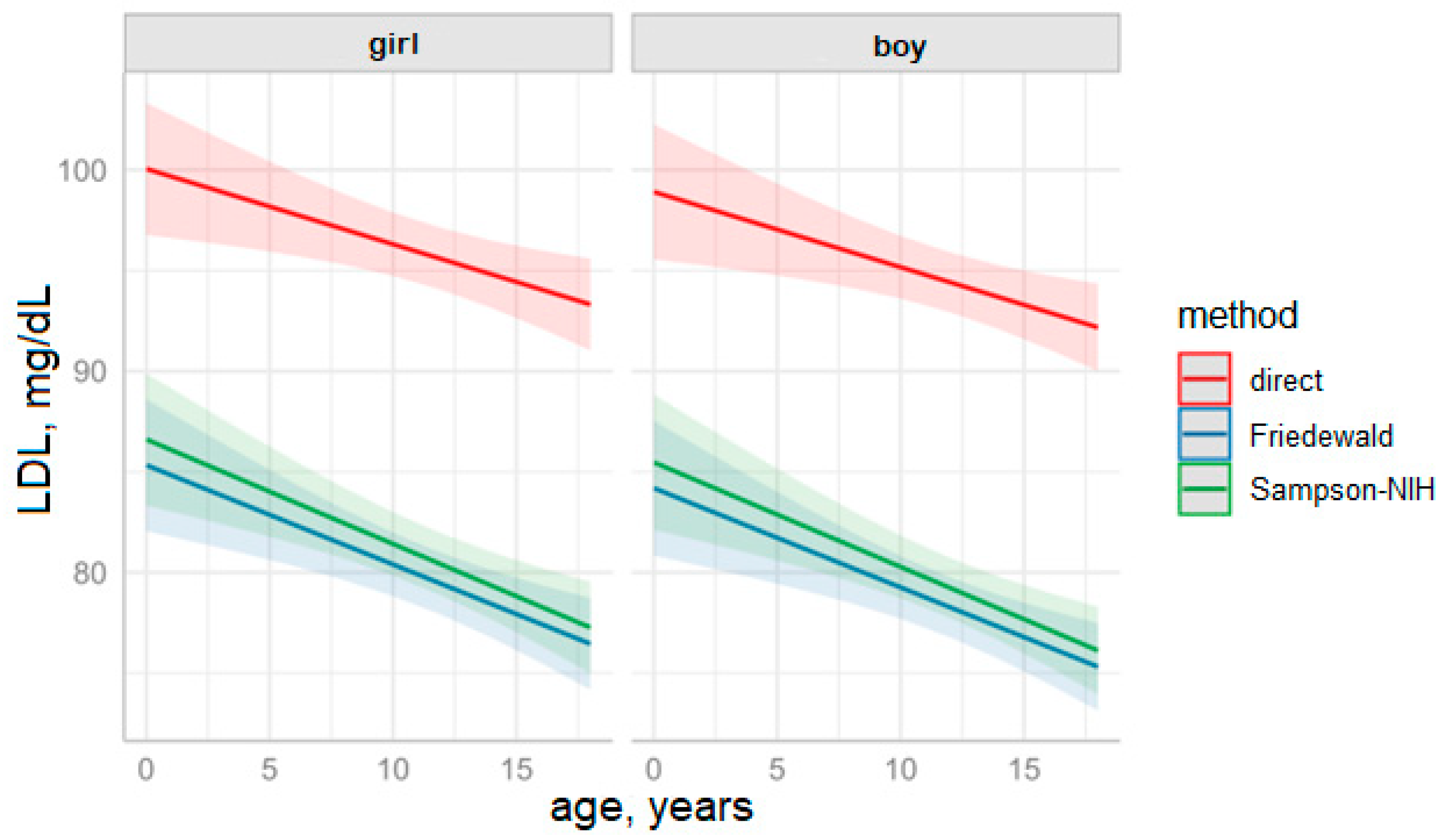 - The direct measurement method yields the highest LDL values for the age of 13 years, which is significantly different from the results obtained by the Friedewald method and Sampson–NIH equation.