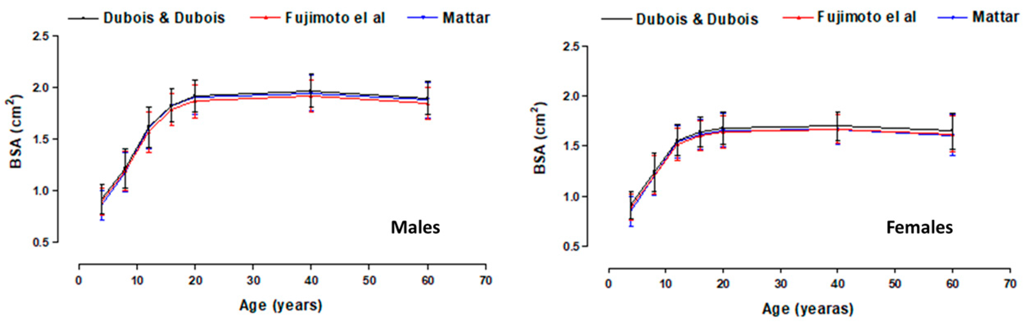 - Mattar, J.A. A simple calculation to estimate body surface area in adults and its correlation with the Du Bois formula. Crit. Care Med. 1989, 17, 846–847. [Google Scholar] [CrossRef] [PubMed]