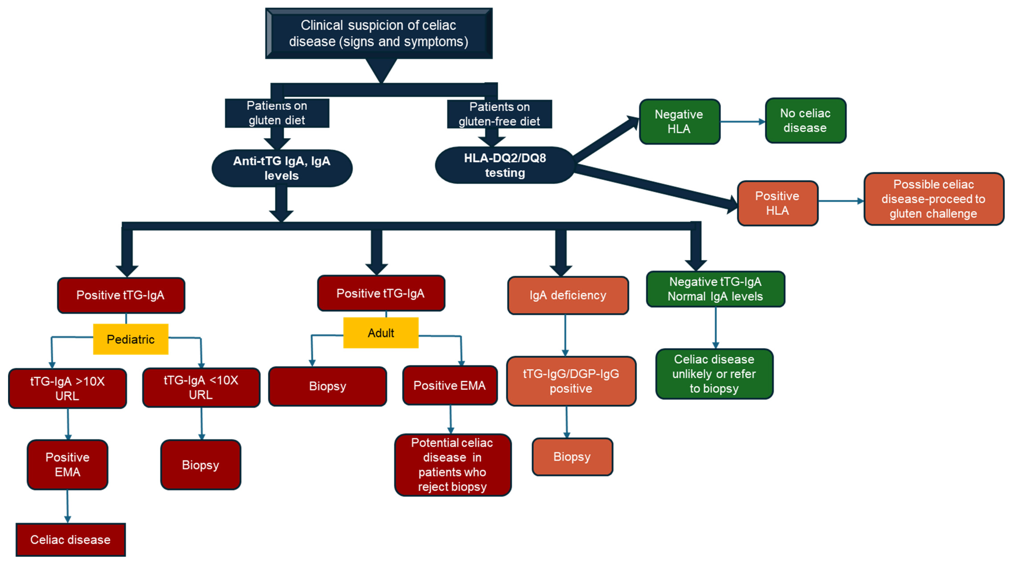 Figure 1 summarizes the algorithm for celiac testing, as recommended by most international guidelines. Some of the limitations of using serology alone to diagnose celiac disease include differences in assay performance between different manufacturers, use of different diagnostic cut-offs and reference intervals, medications, such as immunosuppressants, infections that result in false negative results, and, finally, uncertainty associated with not using the gold standard test—biopsy and histology [49,50,51]. The clinical utility of each celiac serologic test is summarized in Table 2. In summary, the diagnostic algorithm for celiac disease begins with the determination of tTG-IgA and total IgA in patients on a normal gluten diet, followed by duodenal biopsy in adults (or biopsy-free diagnosis in children with tTG-IgA >10× URL and positive EMA), with IgG-based tests used in IgA deficiency and HLA-DQ2/DQ8 testing reserved for patients on a gluten-free diet.