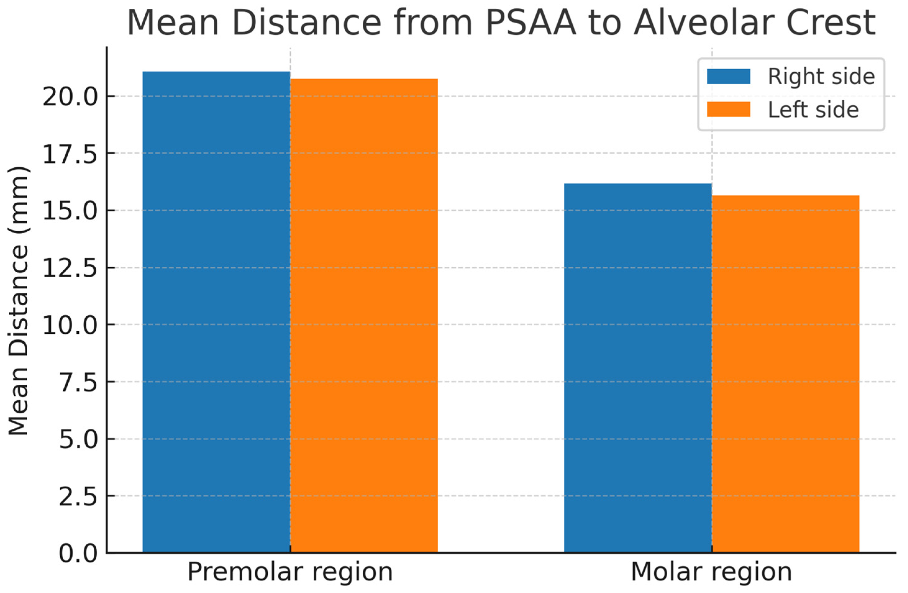 The distance between the PSAA and the alveolar crest was measured at the premolar and molar regions for the right and left sides. The results showed that there was no significant difference between the sides, but significant differences were observed between the premolar and molar regions. The mean distances from the PSAA to the crest in the premolar region were 21.06 ± 6.02 mm on the right side and 20.74 ± 6.55 mm on the left, while for the molar region, the means were 16.17 ± 4.0 and 15.64 ± 4.35 for the right and left sides, respectively, as shown in