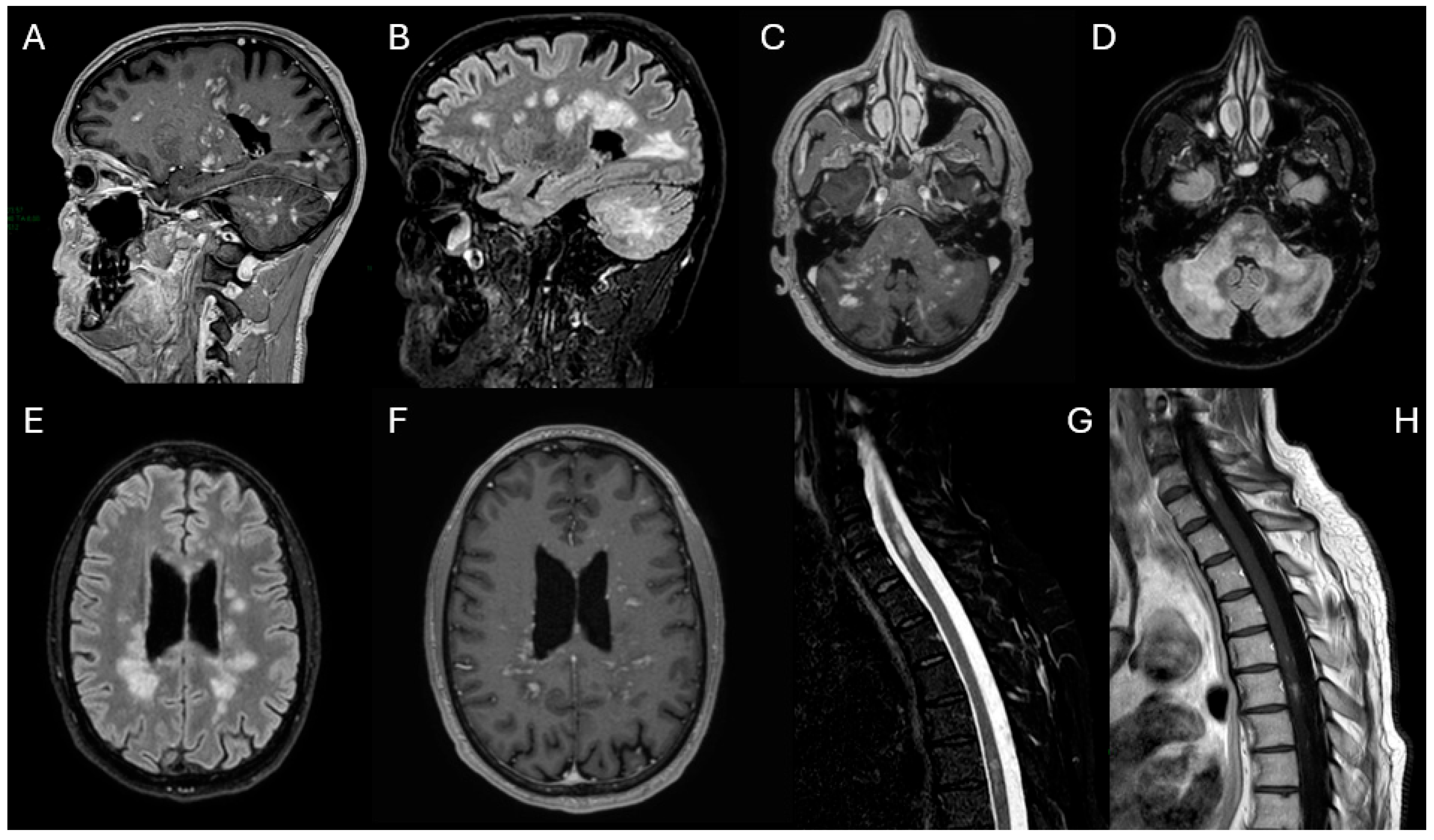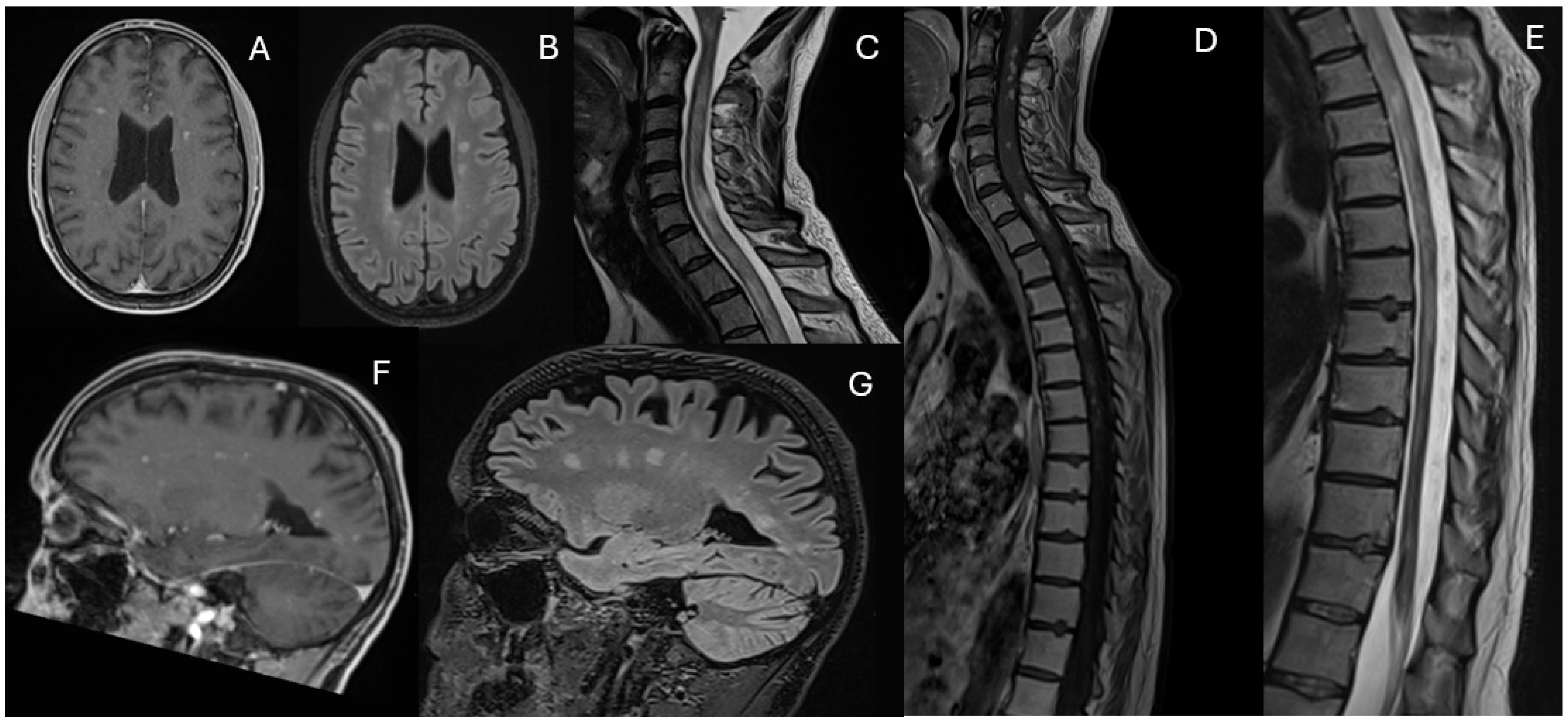 Magnetic Resonance Imaging (MRI) revealed multiple white matter lesions, hyperintense on FLAIR sequences and contrast-enhancing on T1-weighted images, with an asymmetric and periventricular distribution in the brain and spinal cord (