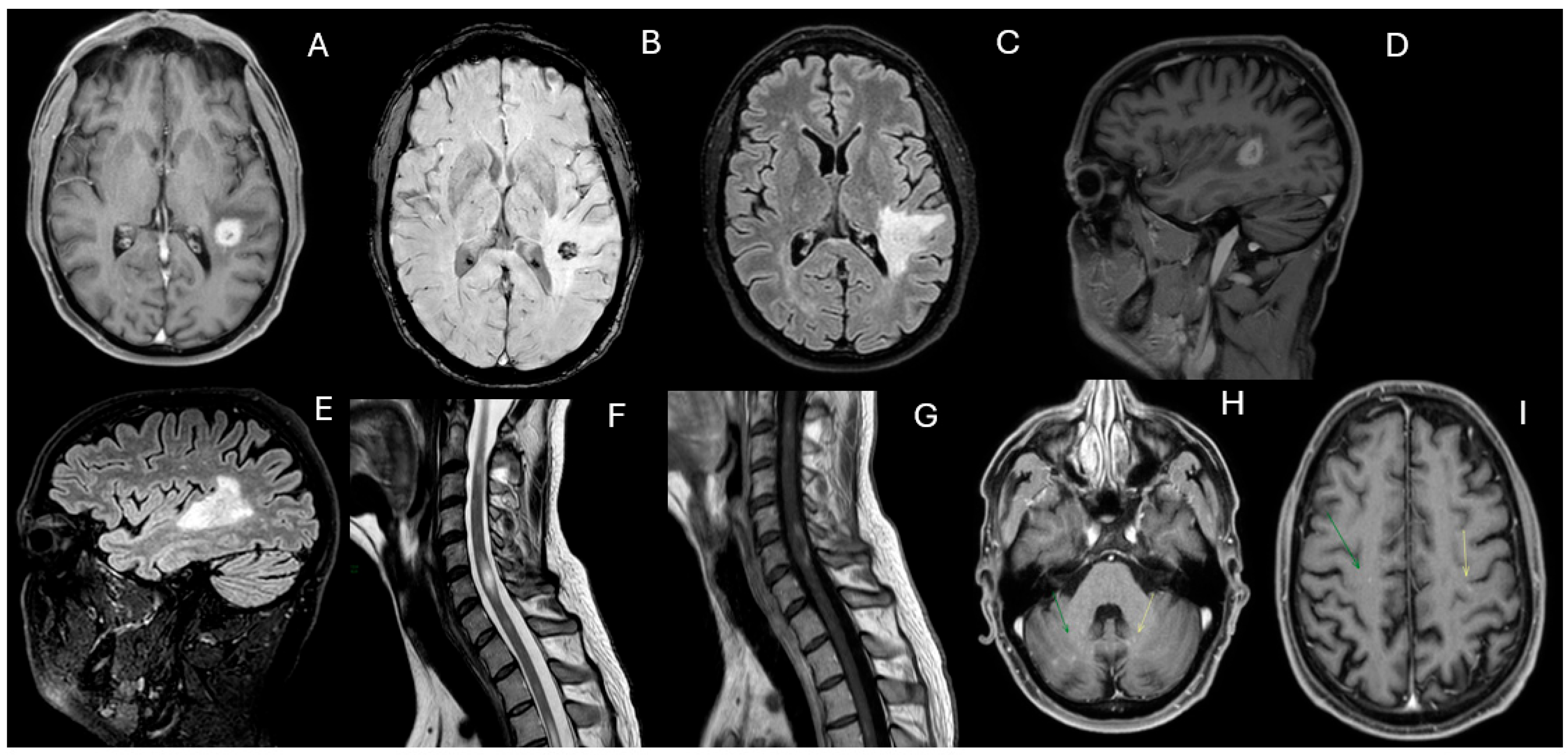 Upon admission to the Neurology Department, a new MRI showed a “mass-like” lesion in the left paratrigonal region with hemorrhagic components, another at the C6 spinal level, and multiple contrast-enhancing lesions were identified in the cerebellum, supratentorial white matter, and spinal cord (