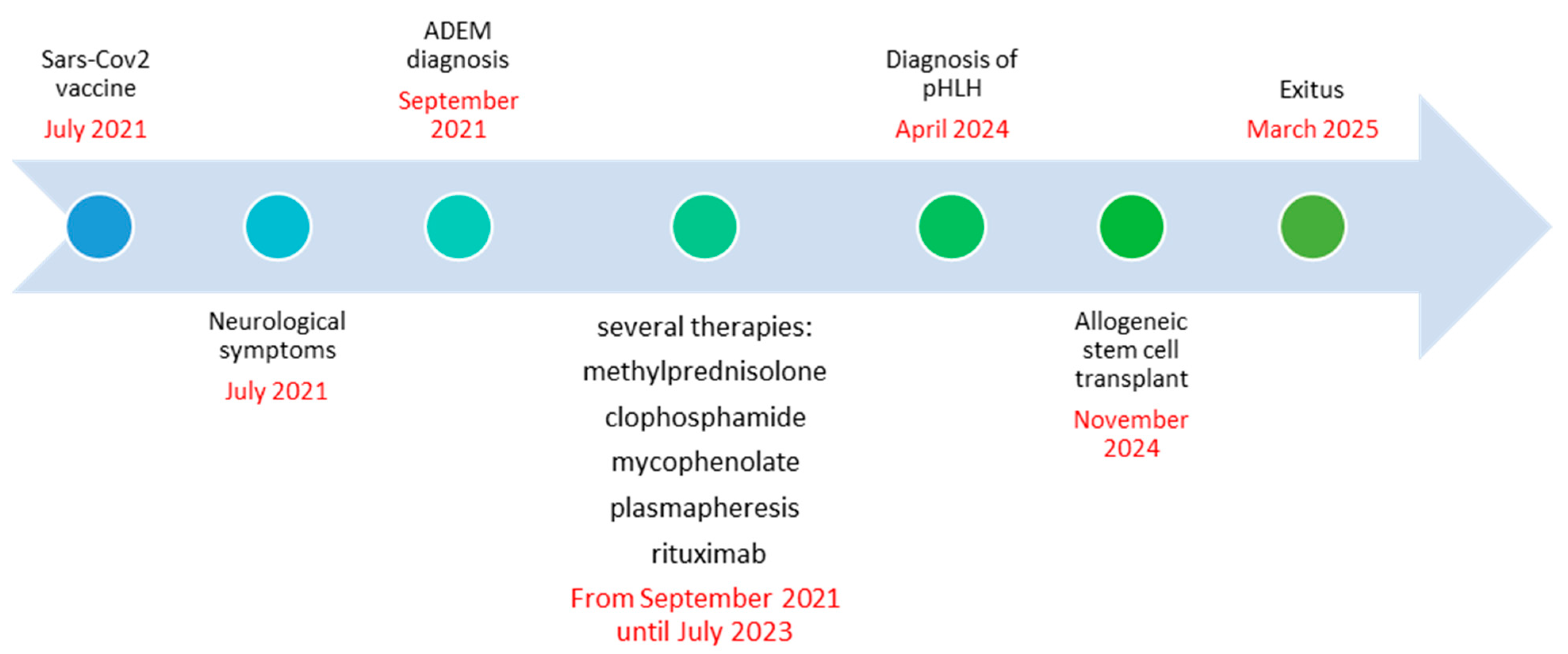 The case report describes an adult-onset form of familial hemophagocytic lymphohistiocytosis (HLH) presenting initially with neurological symptoms following the second dose of the Comirnaty vaccine. The initial diagnosis was ADEM. Notably, a similar case has been reported of a 20-year-old patient, initially diagnosed with ADEM, later confirmed to have HLH due to a homozygous PRF1 gene mutation [