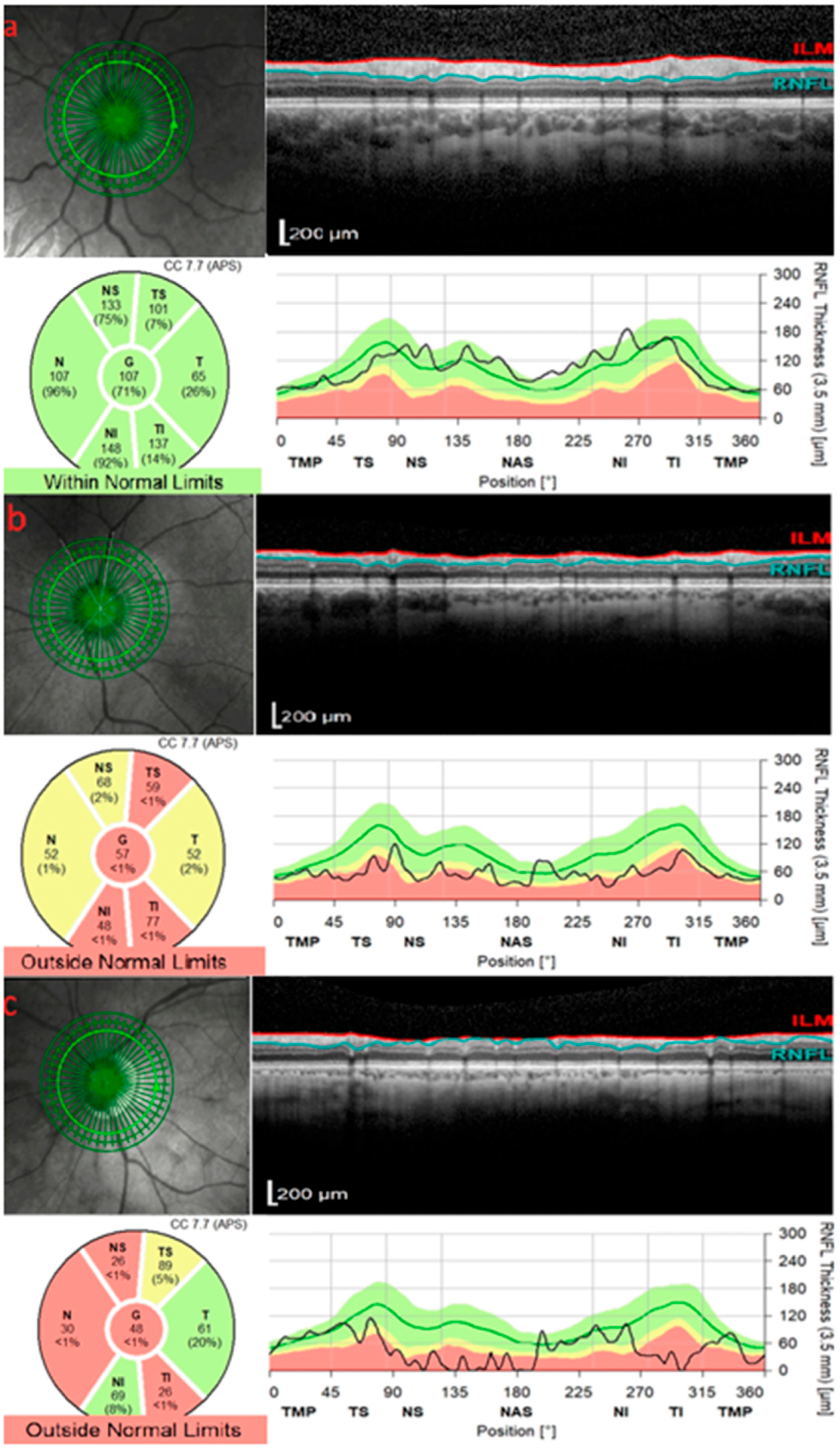 Figure 1. Spectral-domain optical coherence tomography (SD-OCT) analysis of the peripapillary retinal nerve fiber layer (RNFL) thickness in different eyes. (a) Non-glaucomatous emmetropic eye demonstrating RNFL thickness values within normal limits. (b) Glaucomatous emmetropic eye showing diffuse RNFL thinning, predominantly in the superior and inferior quadrants, classified as outside normal limits. (c) Glaucomatous myopic eye with pronounced RNFL attenuation and peripapillary thinning, also outside normal limits. ILM = internal limiting membrane; RNFL = retinal nerve fiber layer; TMP = temporal; TS = temporal–superior; NS = nasal–superior; NAS = nasal; NI = nasal–inferior; TI = temporal–inferior. Adapted from [25]. Licensed under a Creative Commons Attribution 4.0 International (CC BY 4.0) License. © 2024 Zawadzka et al. [25].