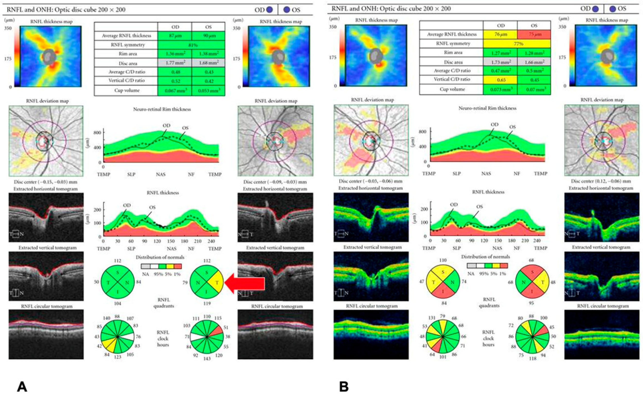 OCT shows a large disc with increased cup-to-disc ratio and thinner neuroretinal rim. Retinal nerve fiber layer (RNFL) thickness is greater than normal individuals with disruption of the ISNT rule as the temporal RNFL is the thickest quadrant. In addition, macular thickness is reduced in those cases [100].