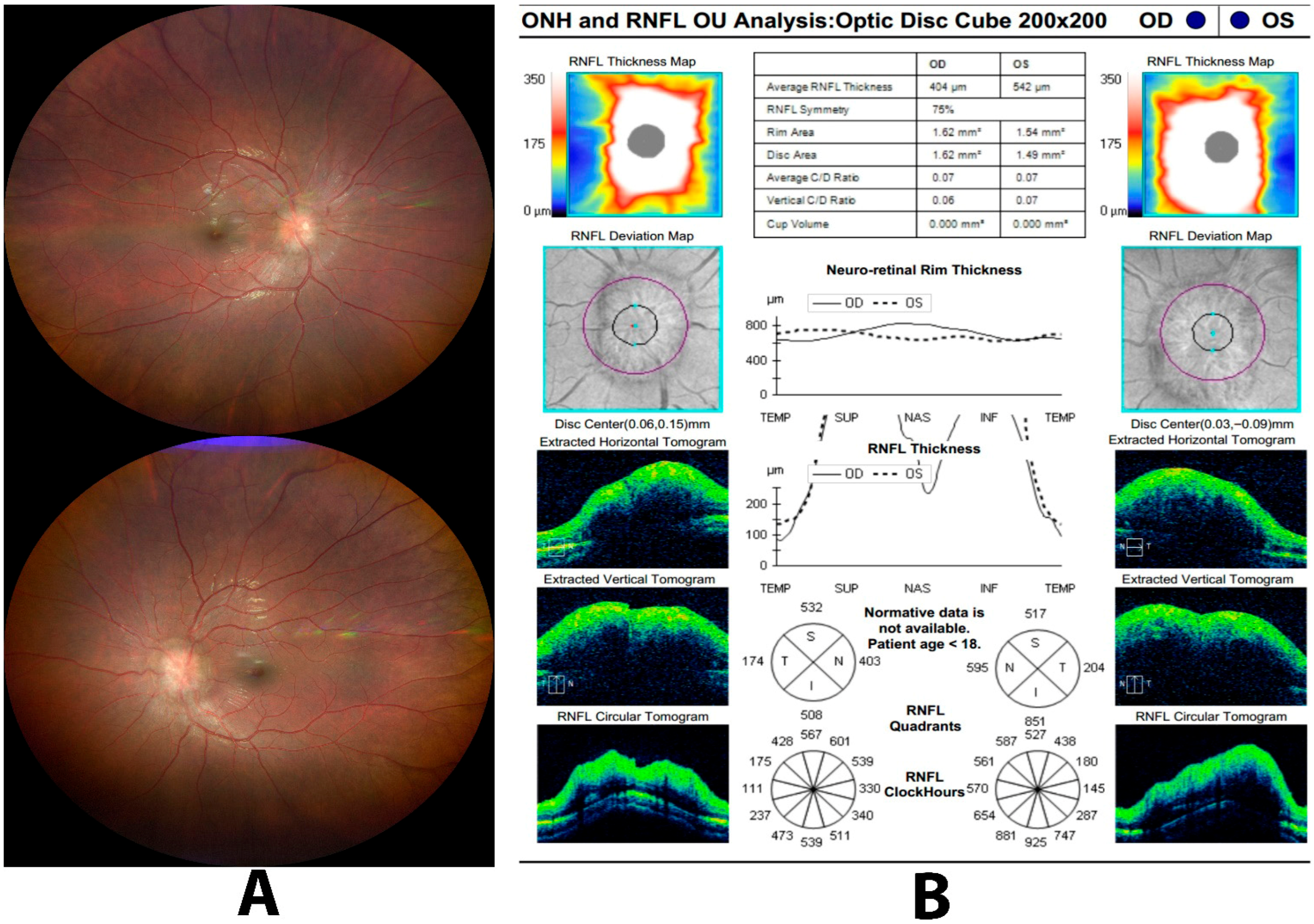 Figure 3. Fundus photograph (panel (A)) and optical coherence tomography of a patient with papilledema due to idiopathic intracranial hypertension (IIH). Fundus images demonstrate bilateral optic disc swelling with blurred disc margins and obscuration of peripapillary vessels, suggestive of true optic disc edema. OCT reveals marked thickening of the peripapillary retinal nerve fiber layer (RNFL) in all quadrants, particularly superiorly and inferiorly, with associated elevation of the optic nerve head on (B)-scan. These findings are consistent with papilledema.