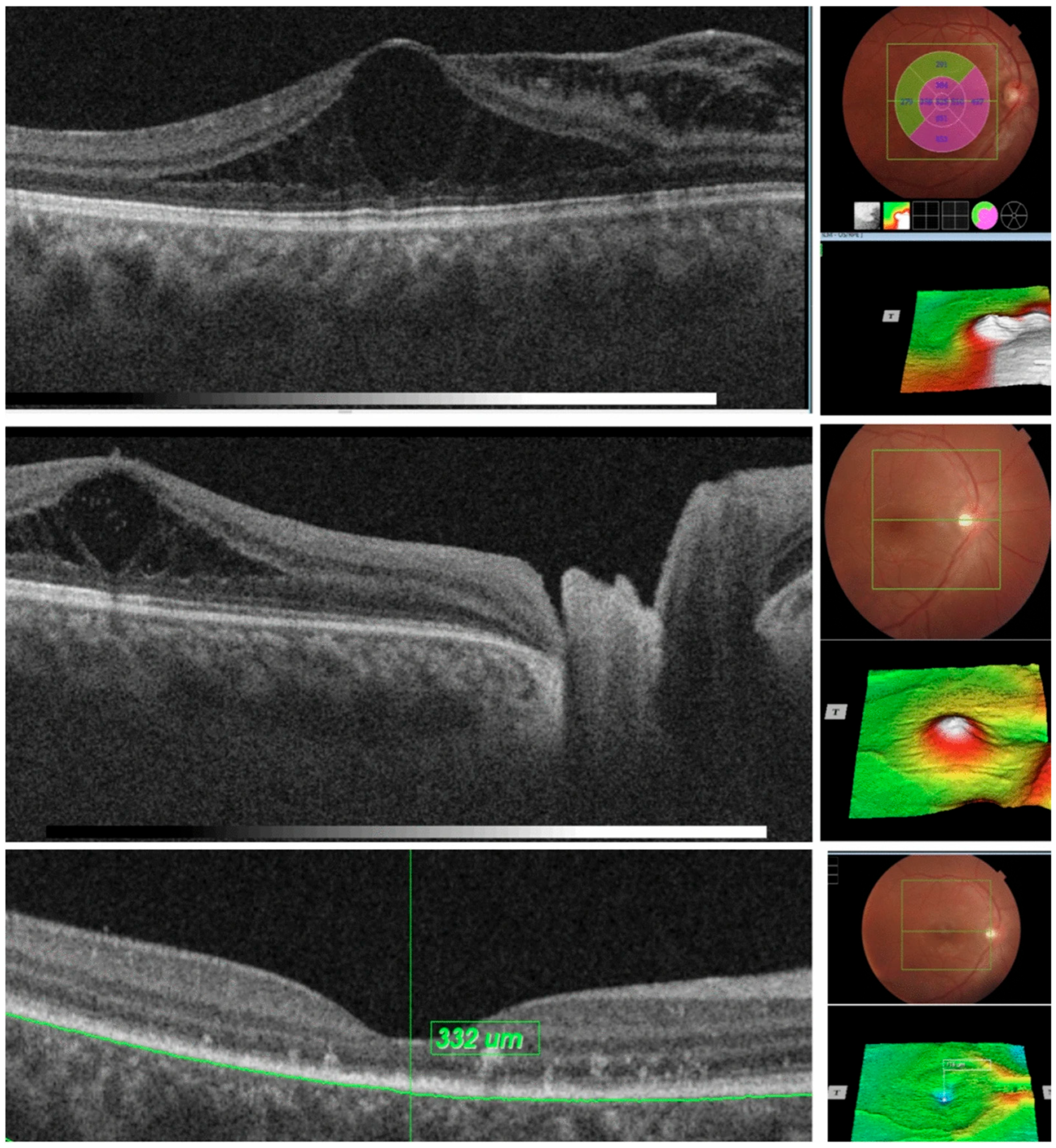 Figure 4. Sequential optical coherence tomography (OCT) scans showing progressive resolution of optic-disc-pit-associated maculopathy after a minimally invasive surgical approach. Initial scans demonstrate subretinal fluid with schitic separation (top), followed by gradual resolution of intraretinal cystoid changes (middle and bottom). Image adapted from [69].