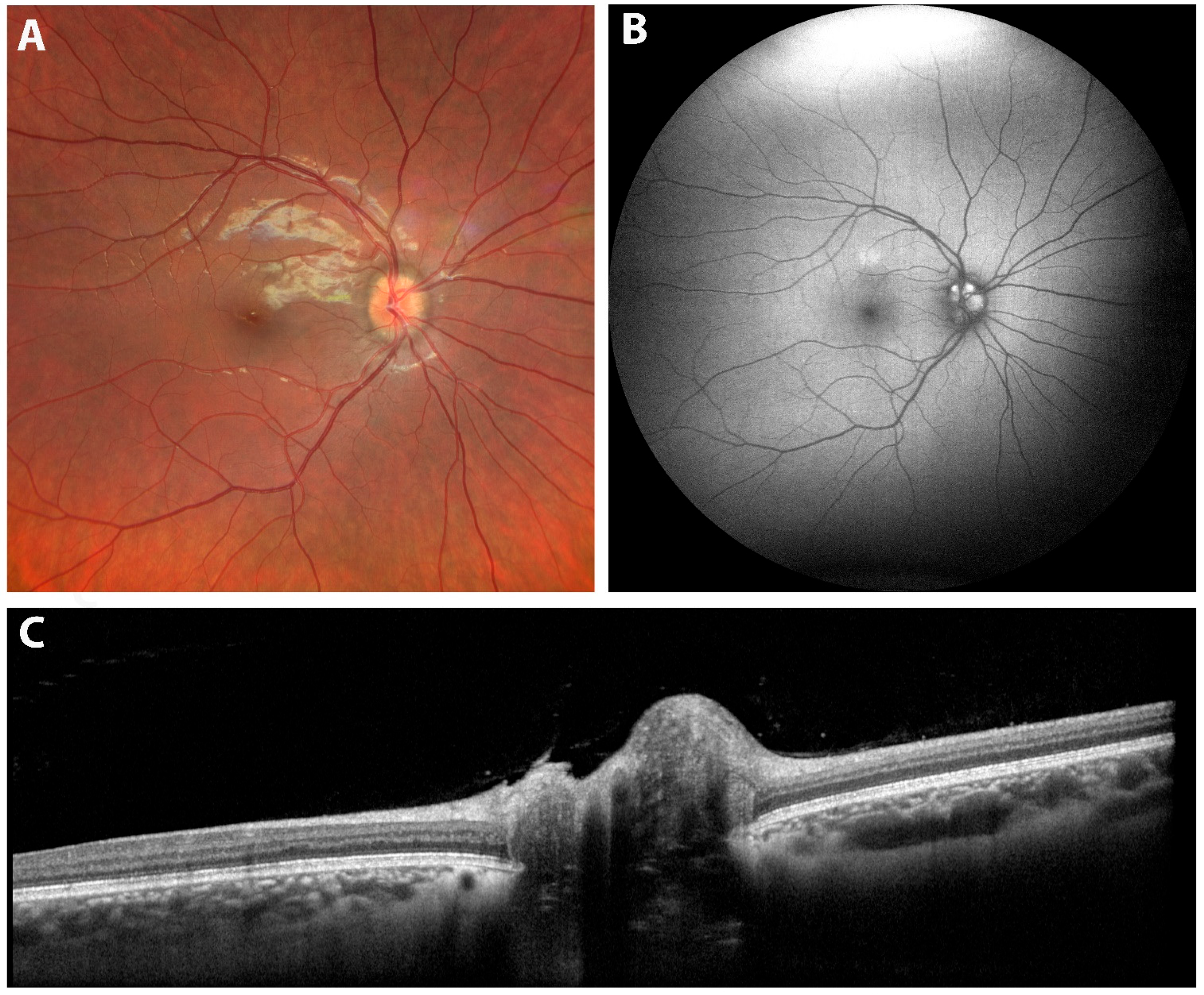 Figure 5. Fundus photo panel (A), fundus autofluorescence panel (B) and optic coherence tomography panel (C) of optic nerve head drusen. Panel (A) shows a crowded optic disc with irregular elevation and visible yellowish refractile deposits consistent with superficial drusen. Panel (B) demonstrates hyperfluorescence over the optic nerve heads. Panel (C) (OCT B-scan) reveals a signal-poor lesion with hyperreflective margins.