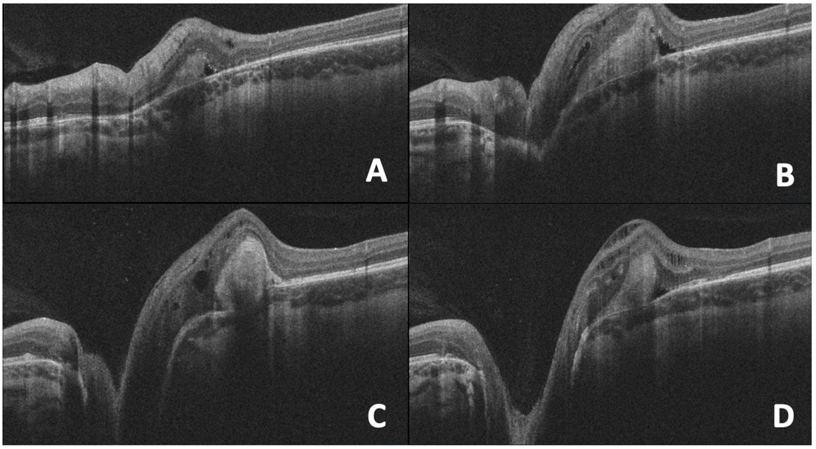Figure 6. Optical coherence tomography (OCT) cross-sections of the left optic nerve and peripapillary region in a case of morning glory disc anomaly. The images (AD) demonstrate an enlarged, excavated optic disc with peripapillary gliosis and associated subretinal and intraretinal fluid consistent with the structural features of this congenital anomaly. Image courtesy of [103].