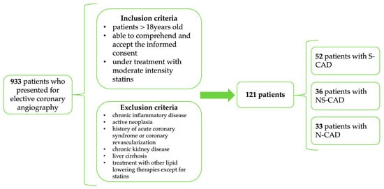 We performed a prospective case–control study that included 121 patients who presented to our hospital for elective coronarography between January 2024 and January 2025. We consecutively enrolled patients referred for elective invasive coronary angiography who were ≥18 years old, able to comprehend and accept an informed consent, who were under treatment with moderate intensity statins (Atorvastatin 10/20 mg or Rosuvastatin 10 mg), and who did not meet any of the following exclusion criteria: chronic inflammatory disease, active neoplasia, chronic kidney disease (eGFR < 30 mL/min/1.73 m2), under treatment with other lipid-lowering therapies, except for statins, or liver cirrhosis (Figure 1). Patients with prior coronary revascularization or history of acute coronary syndrome (ACS) were not considered for enrollment, to ensure a homogenous primary prevention cohort. The indication for coronary angiography was previously set, according to the available European Society of Cardiology (ESC) guidelines.