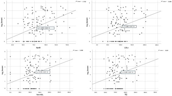 Scatterplots expressing the correlation between apoB, non-HDL-C, LDL-C, and TC and log-transformed Gensini score.