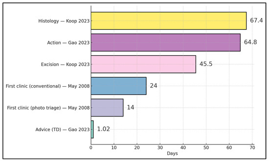 Front-end advice occurred at ~1.02 days via TD in New Zealand [23], and photo-triage halved time to first clinic (14 vs. 24 days) in the UK [20]. In contrast, later milestones were longer: a national-scale Estonian program reported median ~45.5 days to excision and ~67.4 days to histology for triaged lesions [24], while a New Zealand service observed ~64.8 days to “time to action,” indicating that gains from rapid triage can be attenuated by surgical and histopathology throughput constraints downstream [23,24] (Figure 3).