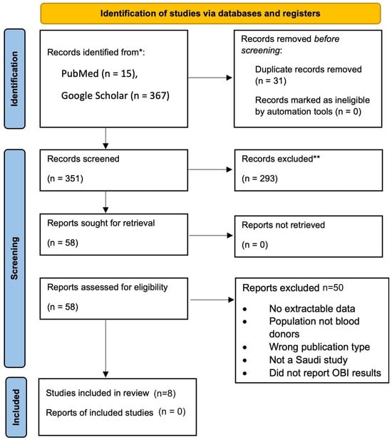 PRISMA 2020 Flow Diagram of Study Selection for the Meta-Analysis of Occult Hepatitis B Infection (OBI) Among Blood Donors in Saudi Arabia.