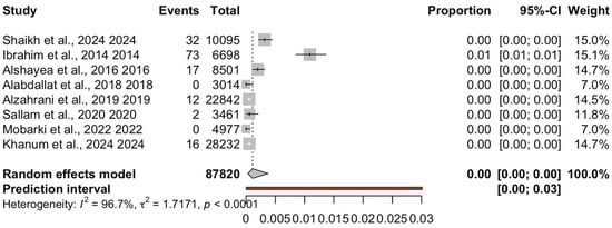 Forest plot of occult hepatitis B infection (OBI) prevalence among Saudi blood donors. Eight studies (k = 8 including [,,,,,,,]; N = 87,820; events = 152) were pooled using a random-effects model with logit transformation and Hartung–Knapp adjustment. The pooled prevalence was 0.12% (95% CI: 0.03–0.39%), with substantial heterogeneity (I2 = 96.7%, τ2 = 1.7171, p < 0.0001). Two studies reported zero events; a single higher-estimate study contributed disproportionately to heterogeneity.