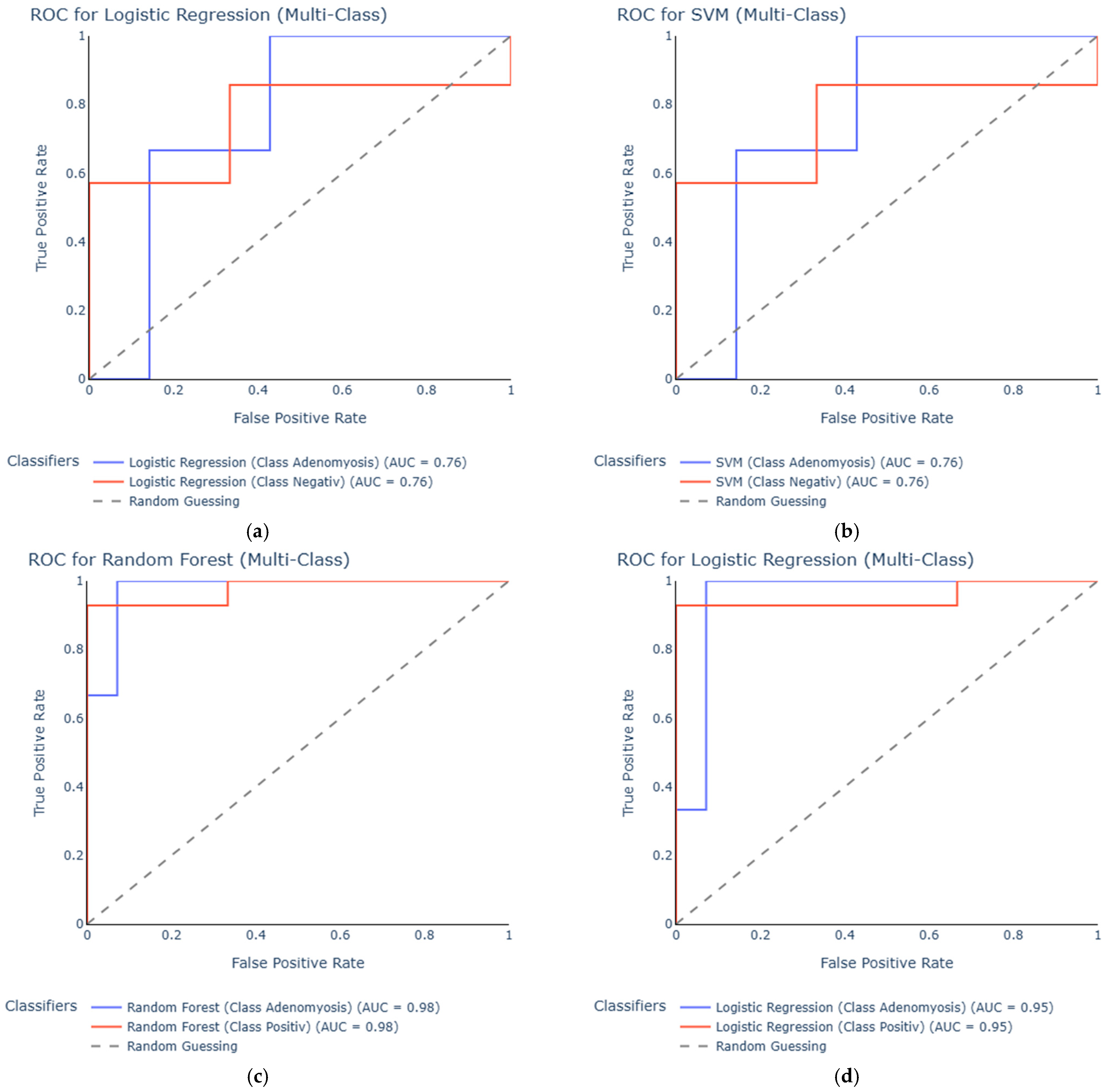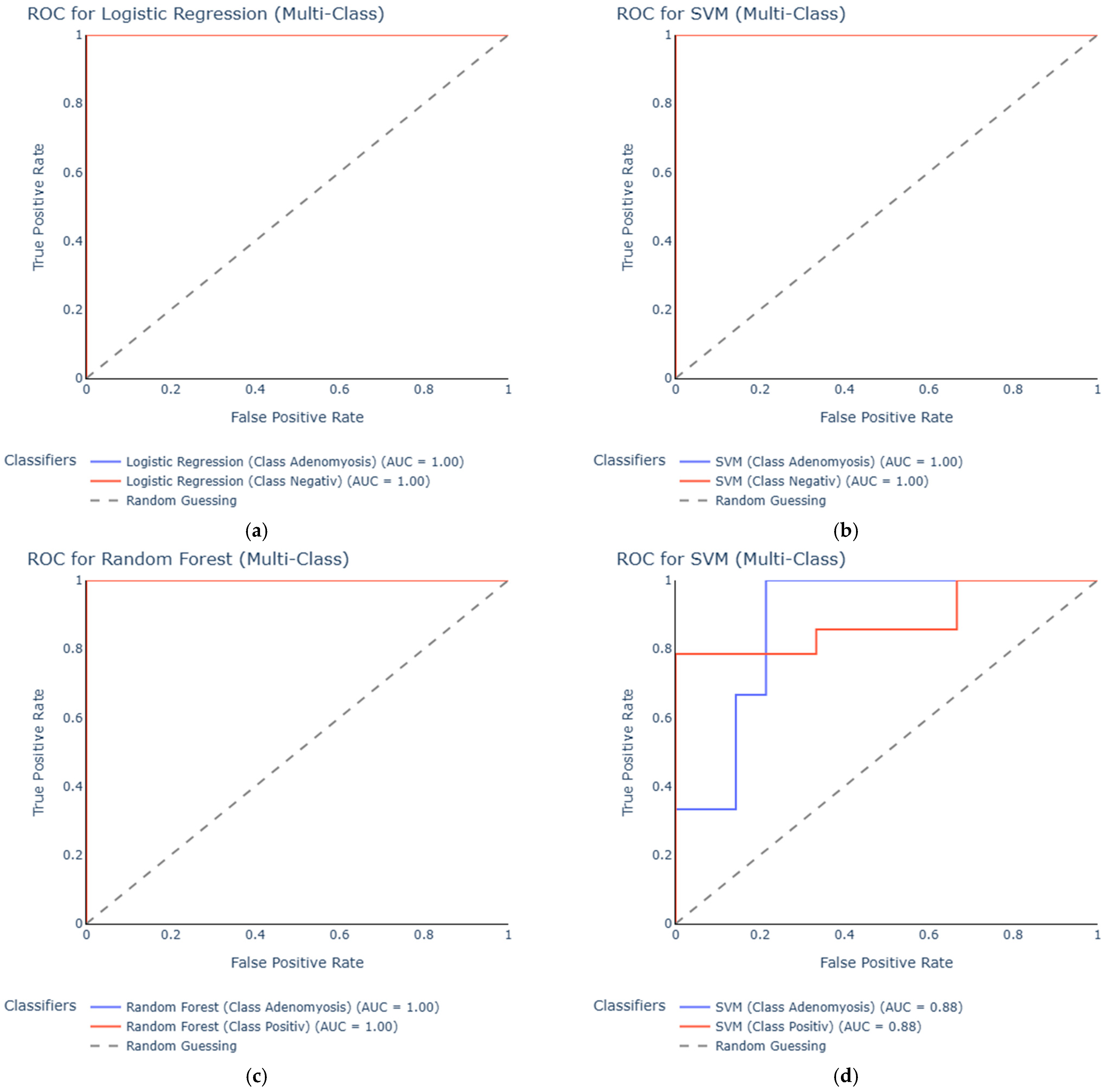 - Bendifallah, S.; Puchar, A.; Suisse, S.; Delbos, L.; Poilblanc, M.; Descamps, P.; Golfier, F.; Touboul, C.; Dabi, Y.; Daraï, E. Machine learning algorithms as new screening approach for patients with endometriosis. Sci. Rep. 2022, 12, 639. [Google Scholar] [CrossRef] [PubMed]