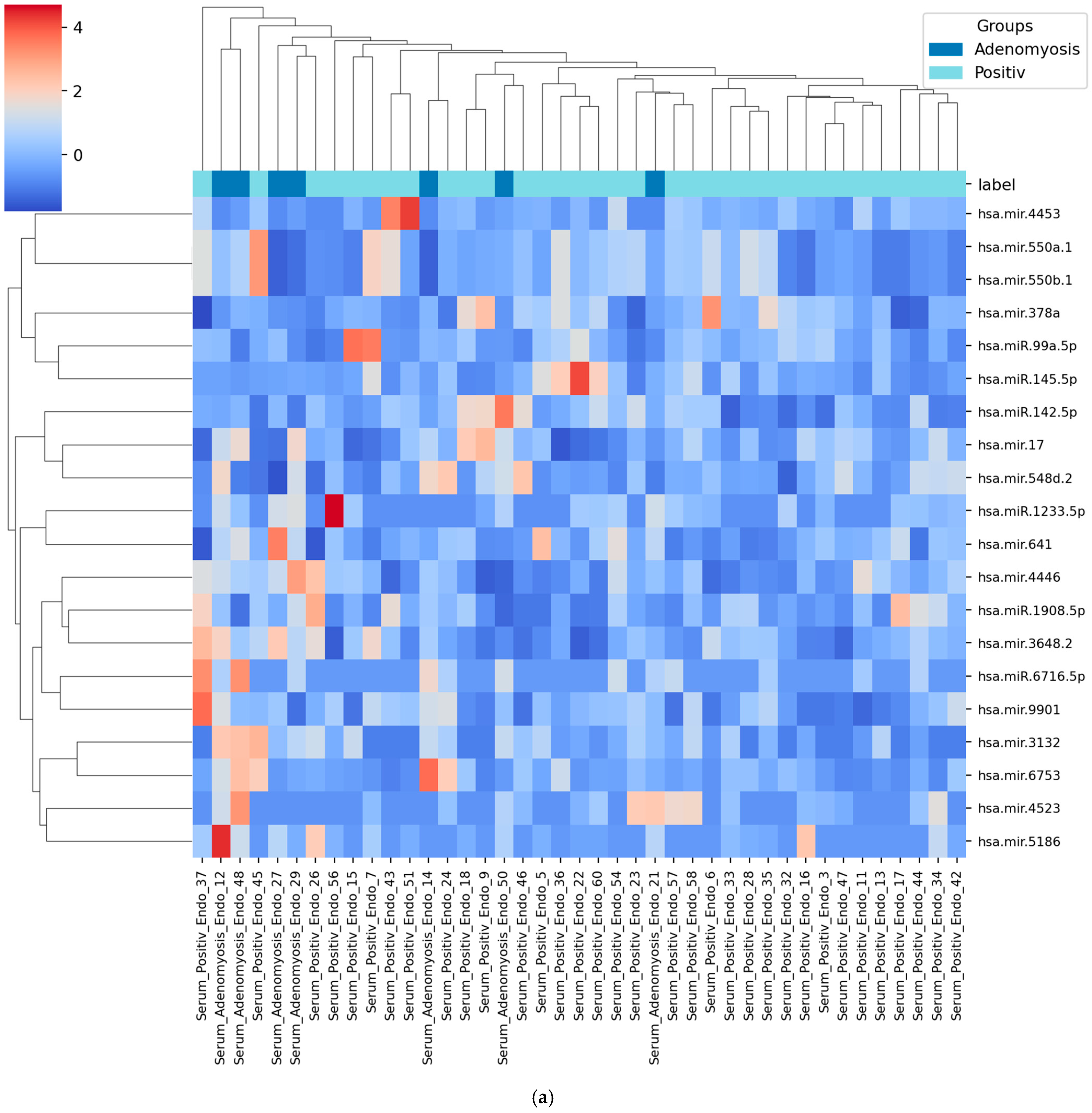 - Kupec, T.; Wittenborn, J.; Kuo, C.C.; Najjari, L.; Senger, R.; Meyer-Wilmes, P.; Stickeler, E.; Maurer, J. Diagnostic Potential of Serum Circulating miRNAs for Endometriosis in Patients with Chronic Pelvic Pain. J. Clin. Med. 2025, 14, 5154. [Google Scholar] [CrossRef]