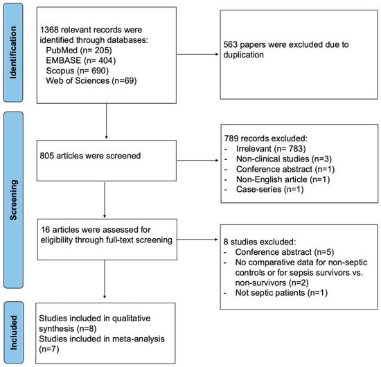 Sepsis severity was reported using the “Sequential Organ Failure Assessment” (SOFA) and the “Acute Physiology and Chronic Health Evaluation II” (APACHE II) scoring systems. SOFA scores were expectedly higher among non-survivors, ranging from 4 to 10.36, compared to 0.5 to 6.5 in survivors (Table 1). Similarly, APACHE II scores ranged from 14.5 to 28.7 in non-survivors and from 6.5 to 22 in survivors (Table 1). The mean arterial pressure (MAP) was reported in three studies [,,], ranging from 71 mmHg to 94.3 mmHg (Table 1), with a lower MAP in non-survivors compared to survivors (82 mmHg vs. 94.3 mmHg) (Table 1). In addition, 21.6% to 79% of patients received vasopressors across three studies [,,]. Notably, control groups varied across the studies, with four studies including healthy participants [,,,], two studies including participants without acute illness [,], and one study including hemodynamically stable elective-surgery patients []. The main patient characteristics in the included studies are summarized in Table 1.