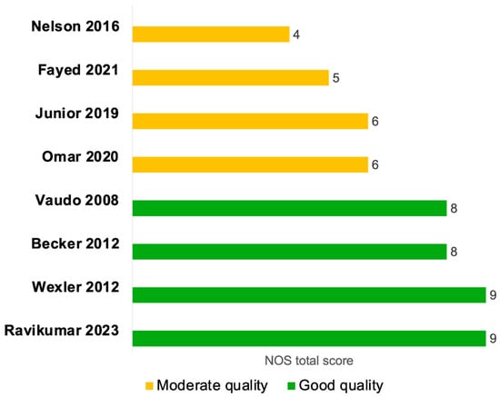 The quality assessment of the included studies was performed independently by three authors (LK, ME, and SA). Inter-rater reliability was not formally calculated; however, discrepancies were resolved through discussion or by consultation with a senior author (ZM) when required to ensure consistency. The “Newcastle-Ottawa Quality Assessment Scale” (NOS) was used to assess the quality of the studies []. The NOS tool evaluates the quality of non-randomized studies, including case–control and cohort studies, across three main domains: selection, comparability, and exposure (for case–control studies) or outcome (for cohort studies). Within each domain, individual items are rated, and a study can receive a ‘star’ per item if it meets the criteria, with a maximum of nine stars across all domains, divided as up to four stars for selection, up to two stars for comparability, and up to three stars for exposure or outcome. A study was classified as high quality if the total score was (7–9 stars), moderate quality if (4–6 stars), and poor quality if (0–3 stars).