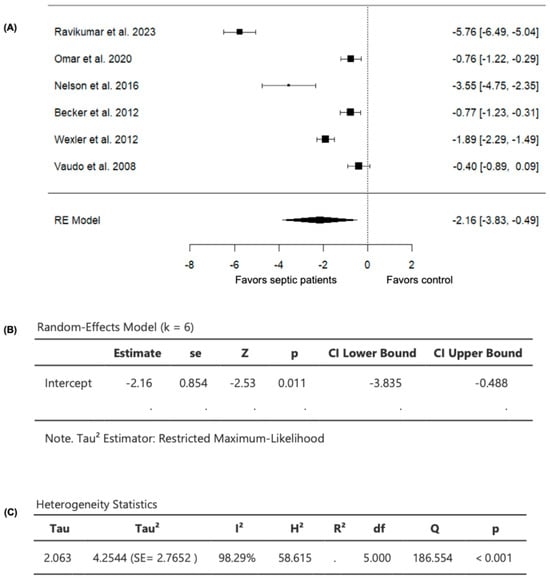 FMD in septic patients and non-septic controls after excluding Ravikumar et al. (2023) []. (A) Forest plot of standardized mean differences (SMD). (B) Random-effects model summary. (C) Heterogeneity statistics.