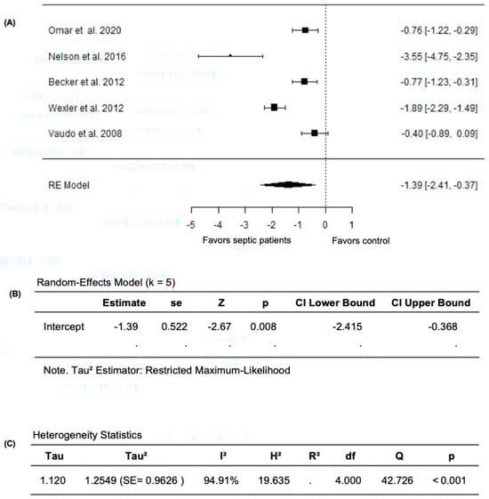 FMD in septic patients and non-septic controls. (A) Forest plot of standardized mean differences (SMD). (B) Random-effects model summary. (C) Heterogeneity statistics.