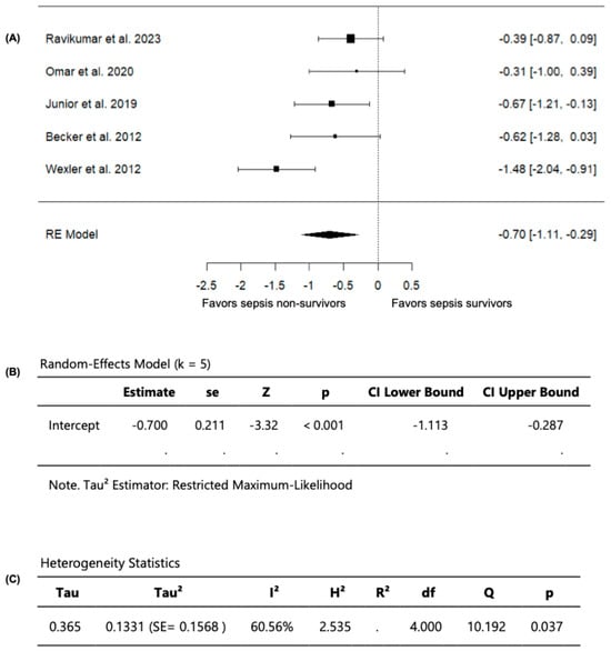 FMD in sepsis non-survivors and survivors after excluding Ravikumar et al. (2023) []. (A) Forest plot of standardized mean differences (SMD). (B) Random-effects model summary. (C) Heterogeneity statistics.