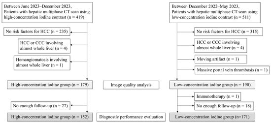 Diagnostic performance and focal lesion analyses were independently conducted by two board-certified radiologists (J.S.K., with 13 years of experience; and J.K.L., with more than 20 years of experience in abdominal CT interpretation), both of whom also participated in the qualitative assessment. For diagnostic performance, patients were eligible if they met one of the following: (1) focal liver lesions confirmed malignant by additional diagnostics or imaging, or (2) benign lesions or no lesions with ≥12 months of adequate imaging follow-up. Patients lacking pathologic confirmation or sufficient imaging follow-up were excluded for lack of a reference standard. Reference standards were established by comprehensive review of clinical records, including electronic medical records, surgical or biopsy pathology results, and imaging (CT, MRI, or PET/CT). Based on these criteria, a total of 323 patients were finally included in the diagnostic performance analysis (HCIC, n = 152; LCIC, n = 171) (Figure 1). Per-patient diagnostic accuracy was assessed; among these patients, those with focal liver lesions underwent per-lesion analyses of diagnostic accuracy and detectability. Typical wedge-shaped arterioportal shunts and simple cysts were excluded. The two reviewers independently rated lesion conspicuity on a 5-point scale (1, not distinct; 2, barely distinct; 3, moderately distinct; 4, fairly distinct; 5, definitely distinct). Scores of 3–5 were considered detected, and scores of 1–2 were considered non-detected. Conspicuity was defined as the higher score across the arterial and portal venous phases. Each lesion was assigned a Liver Imaging Reporting and Data System (LI-RADS) category []. LR-4 or LR-5 were interpreted as indicative of hepatocellular carcinoma (HCC), and LR-M as another hepatic malignancy, such as adenocarcinoma.