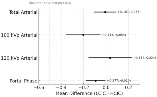 Non-inferiority analysis of overall image quality comparing low-concentration iodine contrast CT (LCIC CT) with high-concentration iodine contrast CT (HCIC CT). Mean differences in overall image quality with 95% confidence intervals (CIs) are shown for the total arterial phase, the arterial phase at 100 kVp and 120 kVp, and the portal venous phase. The predefined non-inferiority margin of −0.5 is denoted by the dotted vertical line. Across all settings, the lower bound of the 95% CI exceeds this margin, supporting non-inferiority of LCIC CT compared with HCIC CT.