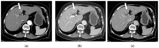 A 91-year-old woman with hepatocellular carcinoma (HCC). CT was performed using low-concentration iodine contrast material (total iodine dose, 518.4 mg I/kg). Overall image quality in the arterial and portal phases was acceptable. (a) An 8-mm enhancing nodule (arrow) is visible on the arterial phase at 100 kVp; (b,c) The nodule shows washout on the portal and delayed phases (arrows). Both reviewers classified the lesion as hepatocellular carcinoma.