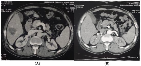 (A). Triphasic CT abdomen (arterial phase) axial cuts revealing, in right lobe segment V, two adjacent focal lesions with homogeneous enhancement (before MWA). (B). The same lesion (arterial phase) axial cuts one month after MWA.