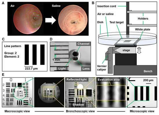 Equipment settings for evaluating endoscope resolution with or without saline. (A) Representative images of air vs. saline. (B) Schematic diagram of the equipment setting. (C) Test target and the line pattern for evaluating 111-μm resolution. (D) Image of the ultrathin bronchoscope. The distance between the green arrows on the ruler represents 1 mm. (E) Image of the line pattern on macroscopic (left), ultrathin bronchoscopic (center), and microscopic views (right, 4× lens). The yellow arrows indicate the reflected light and the shadow.