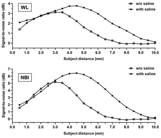 We measured the SNRs of the obtained images (Figure S2). Overall, saline immersion elevated the SNRs and increased the highest SNR in the images obtained using white-light from 3.12 dB to 3.77 dB (1.21-fold). However, the distance with the highest SNR shifted from 3.0 mm to 4.5 mm (Figure 3). Using NBI, saline immersion also increased the highest SNR from 5.18 dB to 6.44 dB (1.24-fold), and the distance with the highest SNR shifted from 3.0 mm to 4.5 mm, the same as when white light was used (Figure 3).