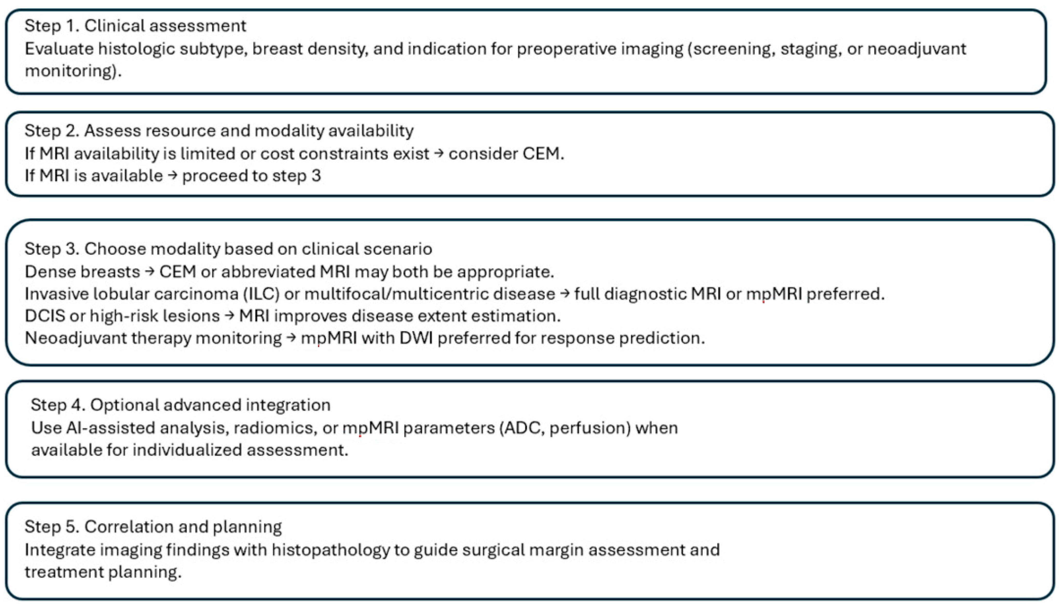 | Contrast-Enhanced Mammography (CEM) | 85–95 | 75–88 | Comparable sensitivity to MRI; superior specificity in dense breasts; faster, cheaper, more accessible | Ionizing radiation; iodine contrast contraindications; fewer longitudinal outcome data | Promising alternative for preoperative staging and dense breasts where MRI is not feasible |