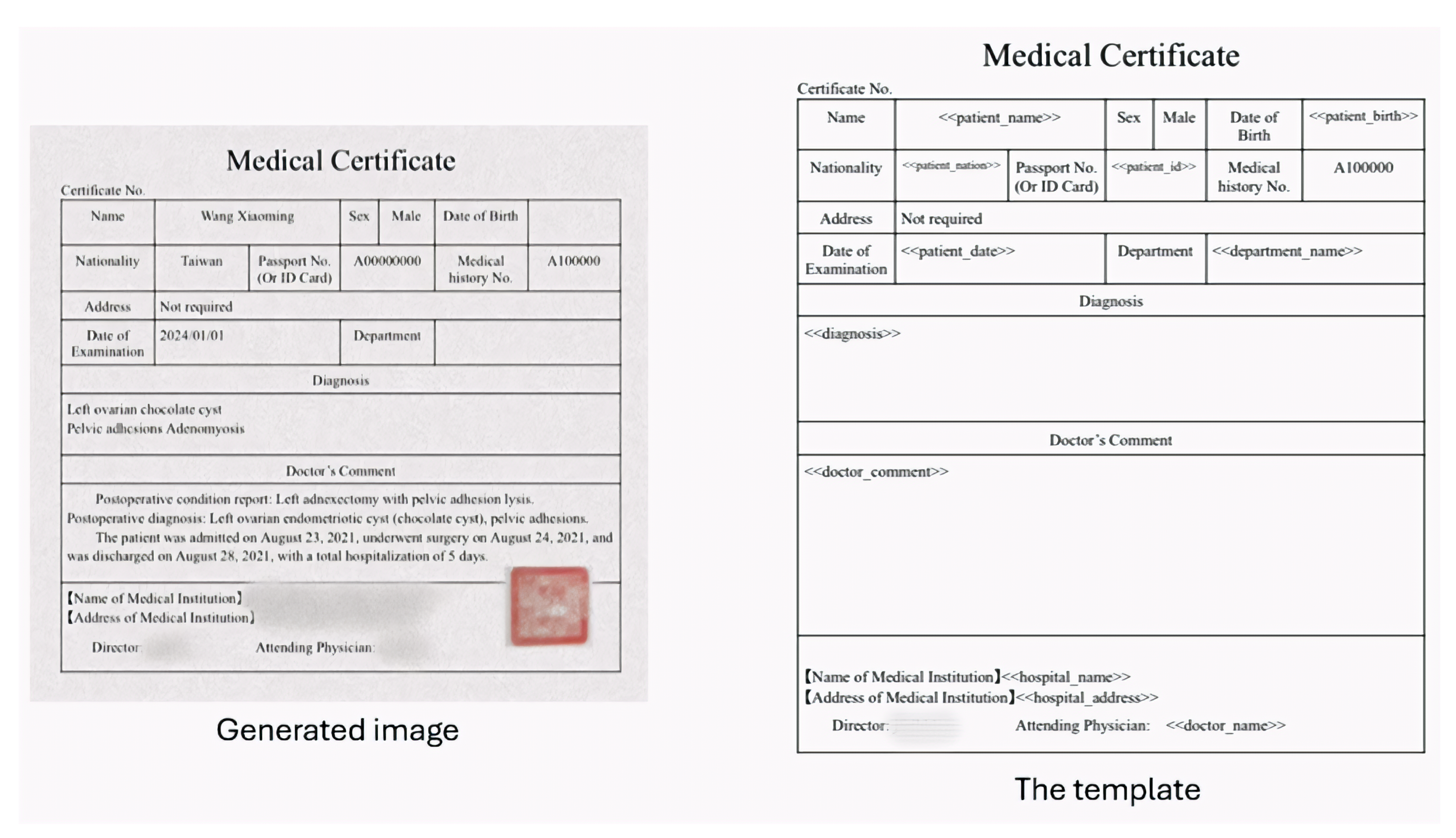 Additionally, the problem addressed in this paper originates from a real-world application in the insurance industry. Currently, in this paper, we focus on Chinese documents. We collected as many authentic documents as possible to support our analysis. Based on these real data, we developed a set of templates for generating the training data. Since medical diagnosis documents cannot be arbitrarily designed, our templates are designed to encompass as many variations as possible. During the training data generation process, the list of hospital names is obtained from the publicly available datasets provided by the Ministry of Health and Welfare to closely simulate real-world cases. The “diagnosis” field is derived from the International Classification of Diseases (ICD) standard. These strategies collectively ensure both the realism and medical accuracy of the generated training data.