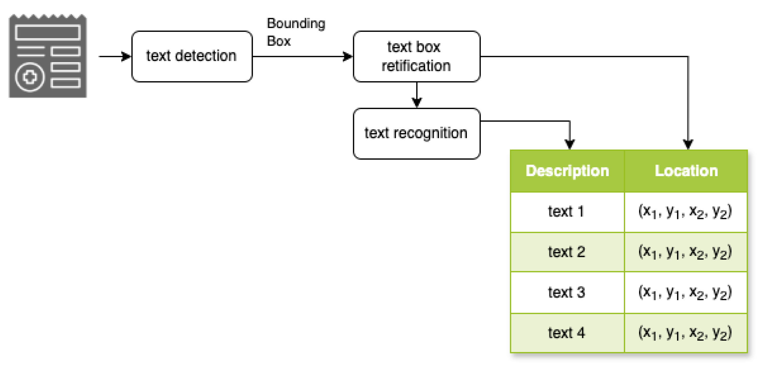 text recognition model. The text detection model transitions into text box rectification, where the system performs geometric transformations to normalize text orientations. This critical alignment process optimizes the subsequent recognition phase by ensuring uniform text positioning and orientation. In the final phase, the text recognition model processes the rectified regions, converting visual text elements into a machine-readable format through character-level analysis. This integrated approach ensures robust text extraction across diverse document types.