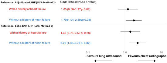 At the individual-level comparison using conditional odds ratio, CXR and LUS method 2 performed comparably in patients with chronic heart failure (OR: 1.05 [0.56-1.97], p: 0.87, Figure 3). However, in patients without chronic heart failure, CXR showed a modest but statistically significant difference over LUS method 2 (OR: 1.70, 1.04–2,80, p: 0.04). These results were confirmed using Echo-BNP AHF as reference (p: 0.02), with even more pronounced results (Figure 3).