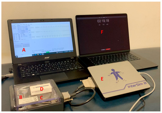 Overview of the experimental setup. (A): PC with the InterSim software for programming the arrhythmias; (B): adapter box in which the respective CIED (C) is connected via the corresponding electrodes. The magnet (D) is placed on the adapter box. (E): Interactive heart simulator (InterSim III); (F): PC with timer. CIED, cardiac implantable electronic device.