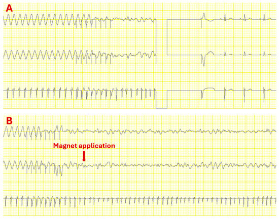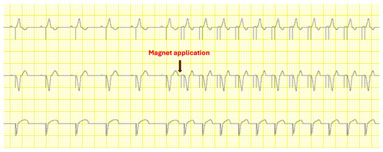 - Ghosh, A.; Sriram, C.S.; Pandurangi, U.M. Unusual response to magnet application: What is the Mechanism? HeartRhythm Case Rep. 2023, 9, 768–772. [Google Scholar] [CrossRef] [PubMed]