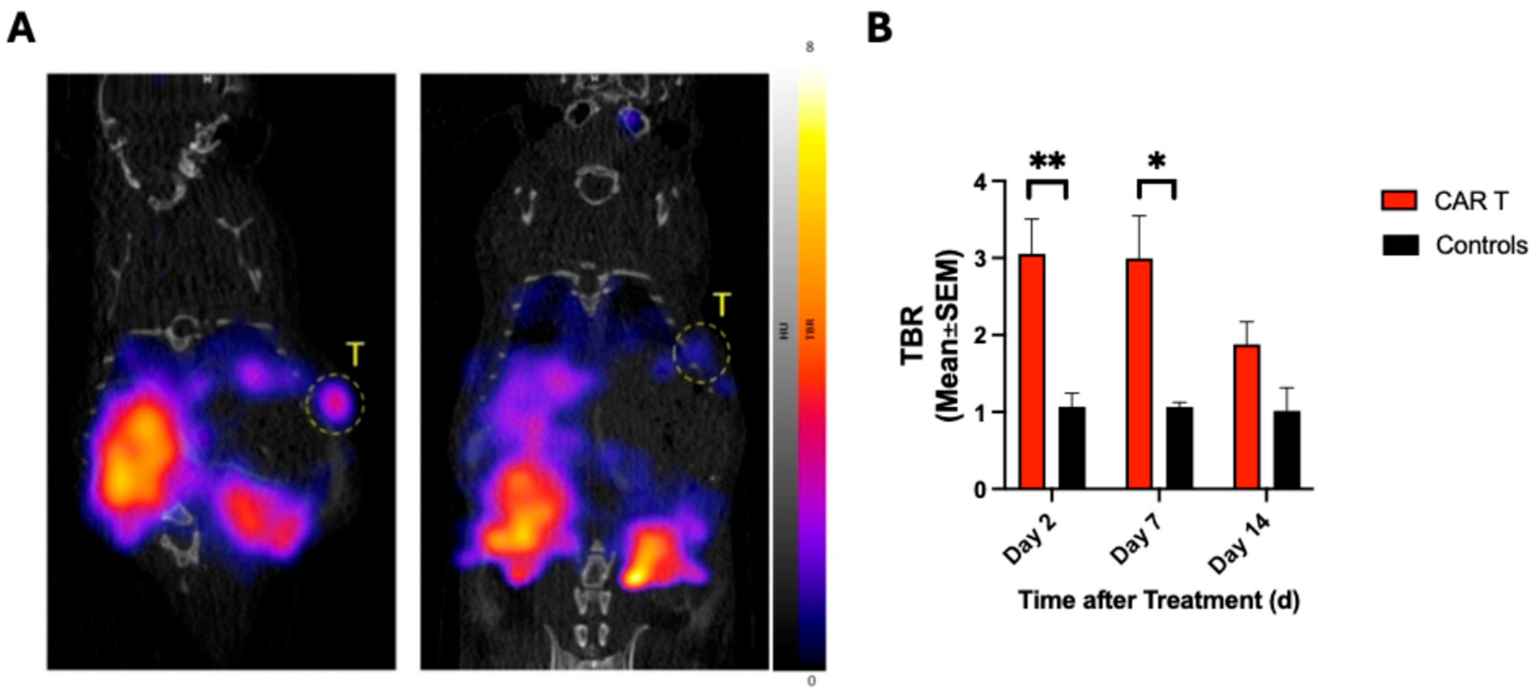 3.3. CAR T-Cell-Treated Mice Showed Greater Tracer Uptake in the Colon