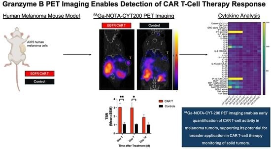 Background/Objectives: Granzyme B (GZB) PET Imaging is a non-invasive tool that can determine tumoral and systemic effects in immunotherapy. We aim to evaluate 68Ga-NOTA-CYT-200 PET Imaging as a molecular imaging approach to determine CAR T-cell therapy response in a human melanoma mouse model. Our goal is to provide a method to monitor CAR T-cell therapy for patients with melanoma and other solid tumors. Methods: A human melanoma mouse model was generated by implanting naïve NSG mice (n = 28) with a human melanoma cell line (A375) subcutaneously (s.c.). After tumor implantation, mice were randomly assigned to receive either the treatment (CAR T) or vehicle solution (controls). After treatment, tumor sizes were measured every other day up to 35 days after cell implantation. 68Ga-NOTA-CYT-200 PET Imaging was performed on days 2, 7, and 14 after CAR T-cell administration to assess T-cell activity within the tumors and organs. The PET Imaging results were correlated with IHC and immunofluorescent staining and cytokine assessment of tumor samples. Results: Tracer uptake within tumors of the CAR T group was significantly greater on days 2 (3.1 ± 1.2 vs. 1.1 ± 0.4, p = 0.002) and 7 (2.0 ± 1.1 vs. 1.1 ± 0.1, p = 0.01) after treatment, even before the CAR T group first presented with significantly lower tumor volumes on day 11 after treatment (61.8 mm3 ± 8.7 vs. 287.1 mm3 ± 157.6, p = 0.05). GZB (p = 0.03) and CAR T (p = 0.001) staining were also significantly greater in tumors of CAR T-cell-treated mice. Inflammatory cytokines such as IFN gamma (p = 0.03), CXCL10 (p = 0.004), and CCL5 (p = 0.02) concentrations were also significantly greater in CAR T-cell-treated tumors. Conclusions: CAR-T-treated tumors show significantly elevated 68Ga-NOTA-CYT-200 uptake compared with controls, consistent with enhanced effector activity.