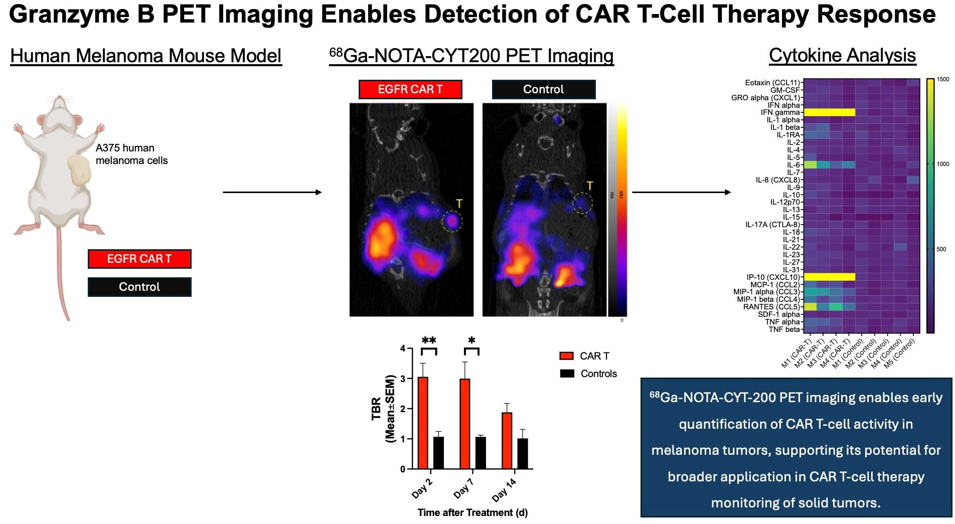 In conclusion, CAR-T-treated tumors exhibited significantly higher uptake of 68Ga-NOTA-CYT-200 compared to controls, indicating increased effector immune activity within the tumor microenvironment. This finding is supported by ex vivo analyses showing elevated granzyme B levels and infiltration of cytotoxic lymphocytes within the tumor, indicating that tracer uptake correlates with granzyme B activity and CAR T-cell infiltration consistent with active immune-mediated tumor cell killing.