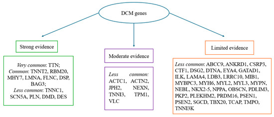 Frequency and strength of evidence of genes associated with DCM; most common: >10% of cases; common: 1–10% of cases; less common < 1% of cases. The categories reported in Figure 2 (“frequency and strength of evidence of genes associated with DCM”) reflect the number of included studies in which each gene was identified, in accordance with the ESC 2023 guidelines [39].