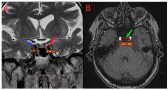 Coronal (left panel A) and axial (right panel B) MRI sections showing the measurement of the diameters of the right (red pointer) and left (blue pointer) internal carotid arteries and the intercarotid distance within the cavernous segment (panel B, green pointer).